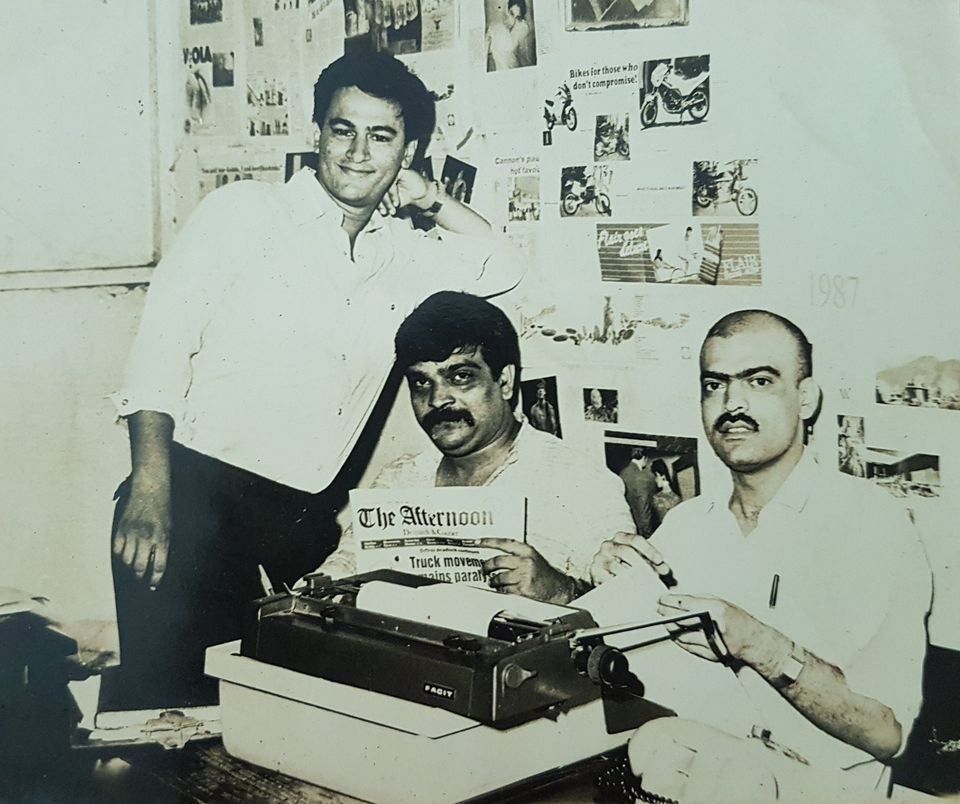 The picture was taken in the newsroom of The Afternoon Despatch & Courier. Baliga and I were Chief Sub-Editors on the News Desk; Mobin was a Special Correspondent, he covered politics, crime, and the courts. I was in charge of the paper during the day. Baliga did the night (graveyard) shift. Mobin had no timing. He reported working when he had a story. Which he filed with a sense of urgency on a battered Fawcit typewriter. Banging the keys hard. A cigarette in his mouth.