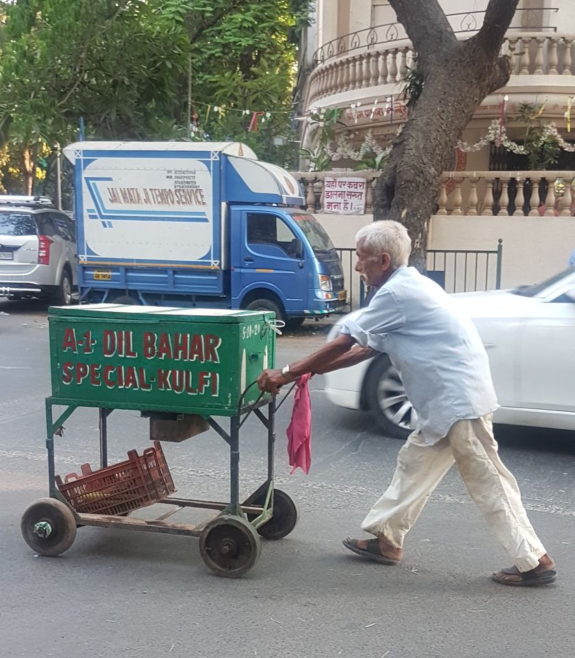 the street next to my building while pushing a pushcart ice cream dispenser and selling Kulfi without announcing his arrival with a sales call. He did not ring the bell. The sign on his ambitious cart read, “A1 Dil Bahar Special Kulfi,” with incredible generosity. This meant that the kulfi was extraordinary, delicious, and of exceptional quality. I didn’t have the guts to check whether this was accurate. Additionally, I always preferred to purchase Kulfi from the Punjab Sind Dairy nearby whenever I felt like having it. Delicious and creamy. But I couldn’t help but think about the old man often. He made the Kulfi himself, right?