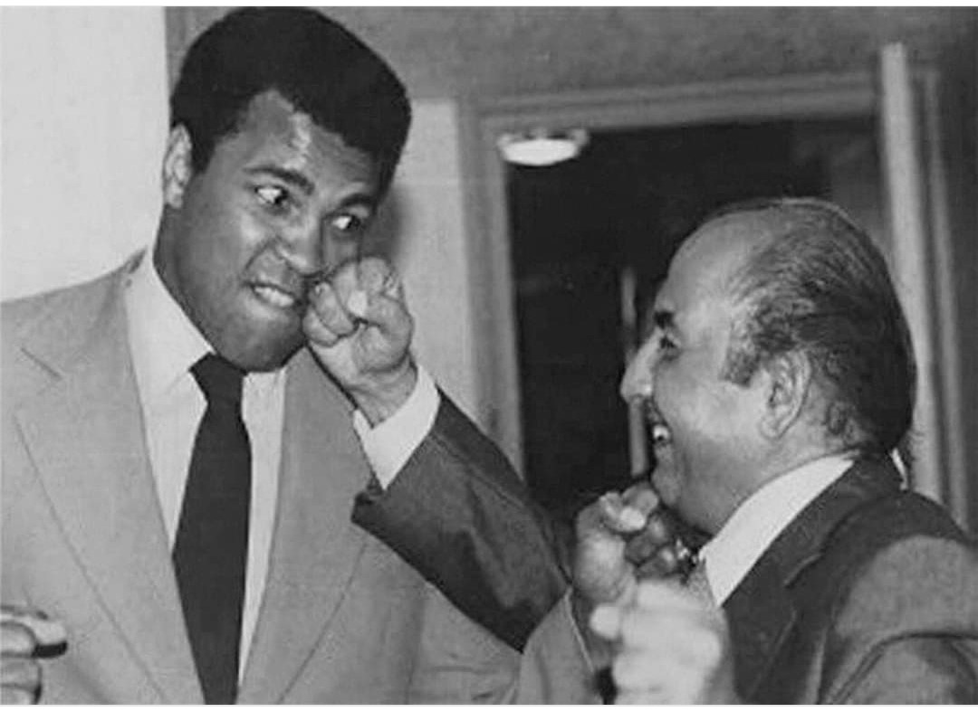 Take a look at what I discovered on Google Photos. This is a rare photograph of Muhammad Ali sparring with Mohammed Rafi. It was photographed in January 1980. When Ali went to Bombay.